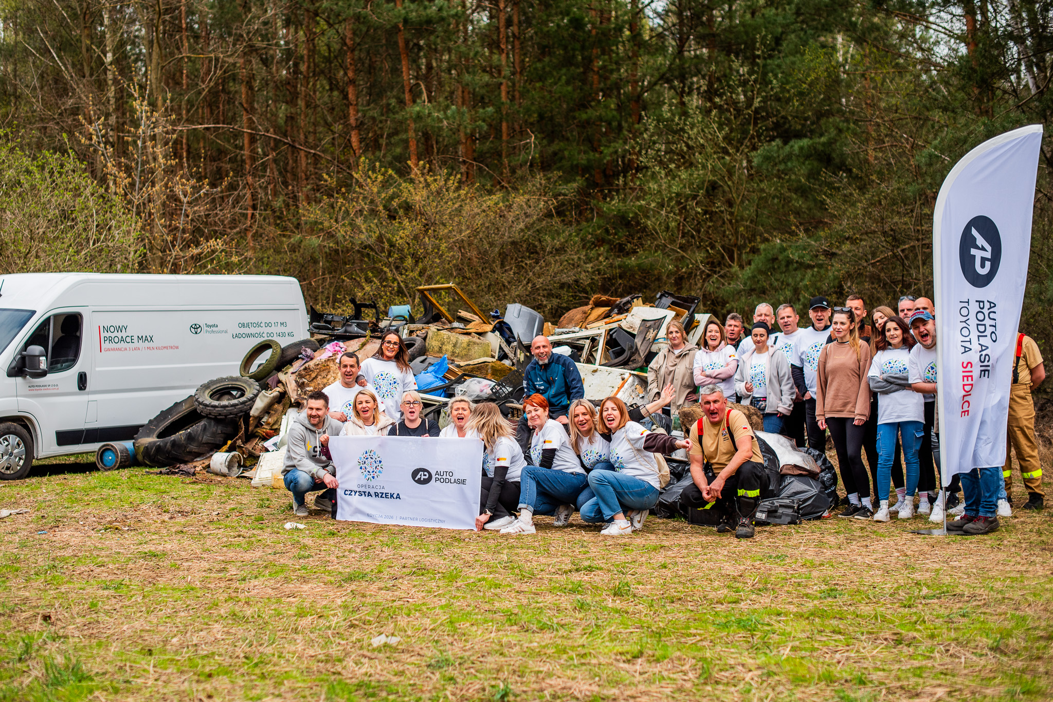 Czwartkowe spotkanie rozpoczęliśmy od sesji zdjęciowej pracowników salonu Toyota Auto Podlasie w Siedlcach oraz trzech niezawodnych samochodów operacyjnych: Toyoty Proace, Toyoty Corolli oraz Toyoty Hilux. Po zakończeniu zdjęć udaliśmy się na wspólną akcję sprzątania lasu położonego na terenie gminy Domanice.