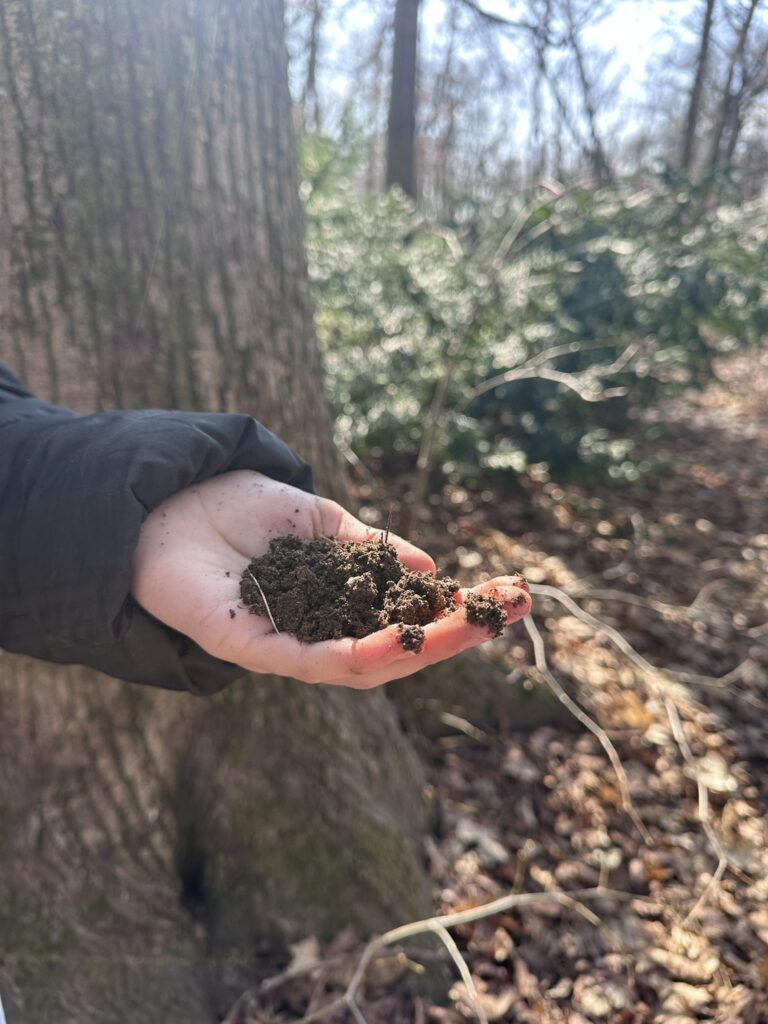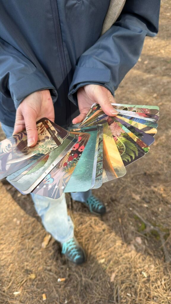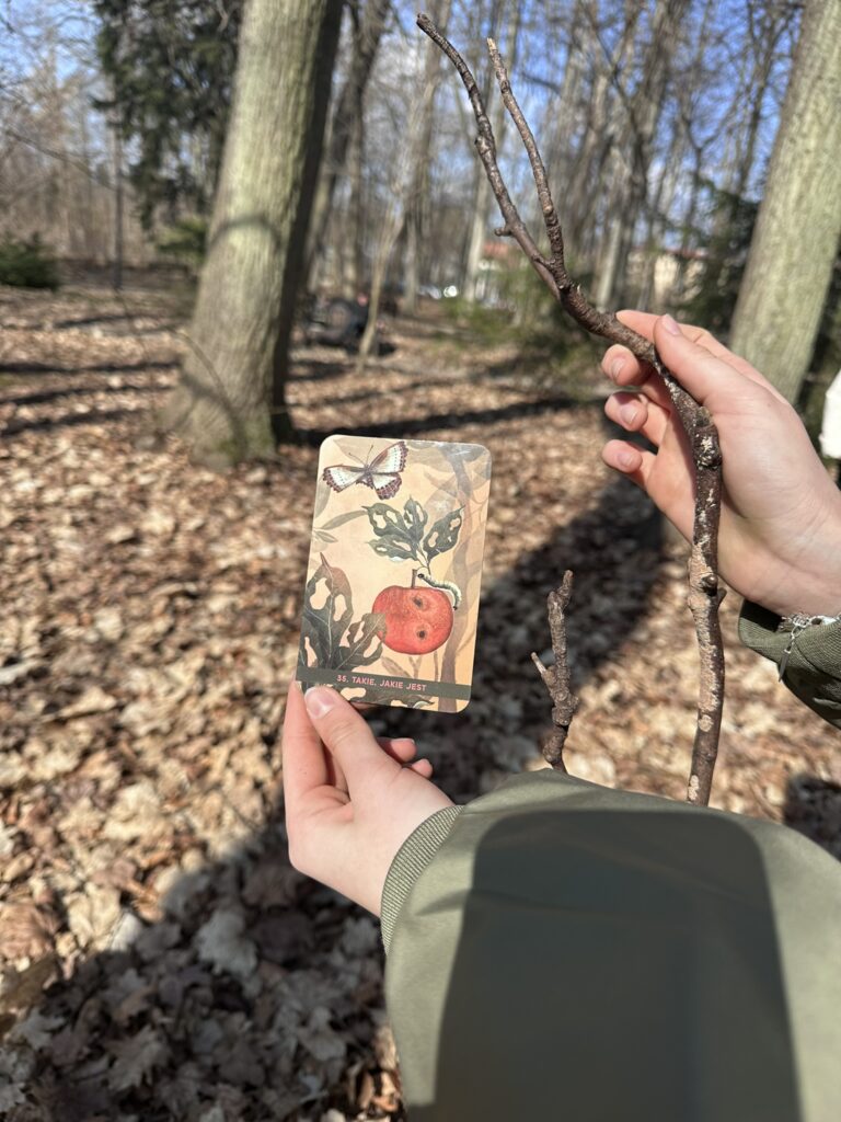Na koniec zanurzaliśmy się w otaczającej nas naturze i pracowaliśmy z kartami „Moc lasu”. Każdy wylosował swoją indywidualną kartę z hasłem, którą interpretował samodzielnie w wybranym przez siebie miejscu. Na koniec dzieliliśmy się wrażeniami z doświadczenia z elementami kąpieli leśnej, którą przeprowadziła edukatorka Izabela Sałamacha.